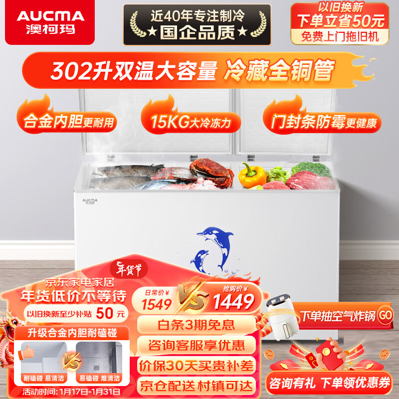 澳柯玛(AUCMA)302升 冰柜家用双温双箱商用家用大容量冰柜卧式冰柜囤货冷柜冷藏全铜管BCD-302CNE以旧换新价格:1549.00元!