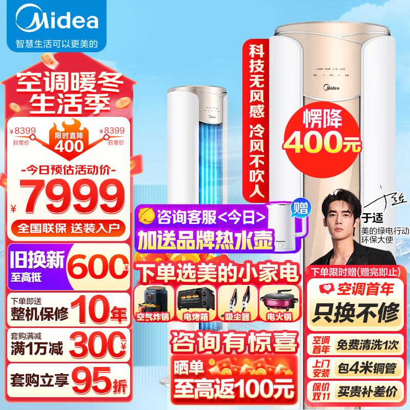 美的(Midea)新一级 纤白 大2匹 变频冷暖无风感 智能家电 家用客厅立式空调柜机 KFR-51LW/N8MWD1价格:7999.00元!