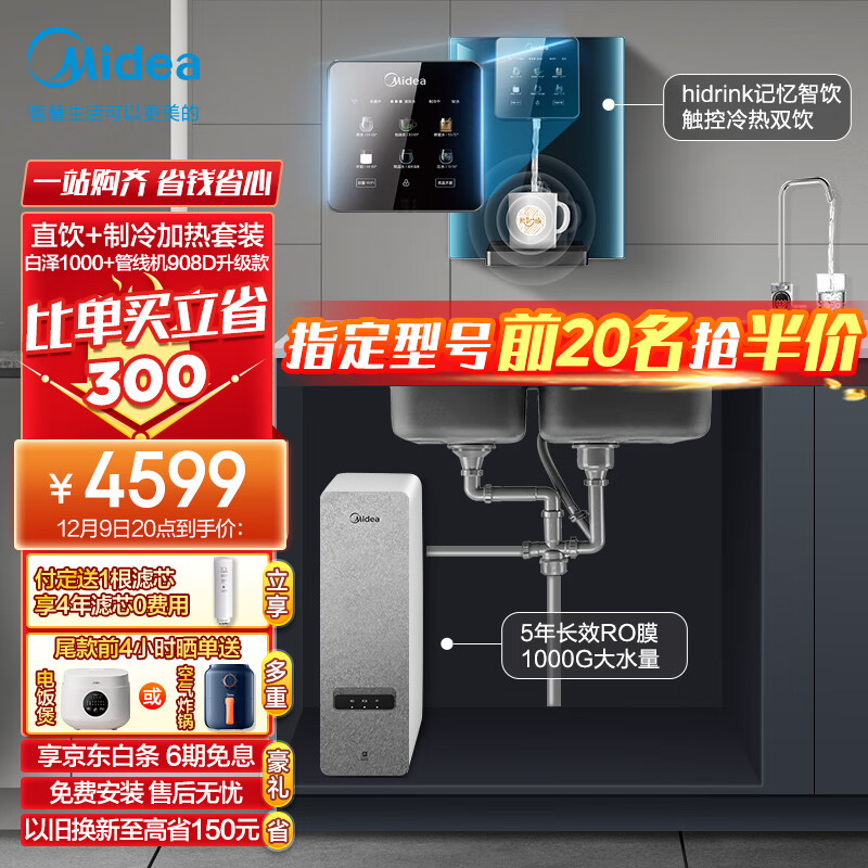 美的(Midea)直饮冷热净水器套装【白泽1000+管线机908D升级版】hidrink智能 家用壁挂式即热一体净饮机价格:4599.00元!