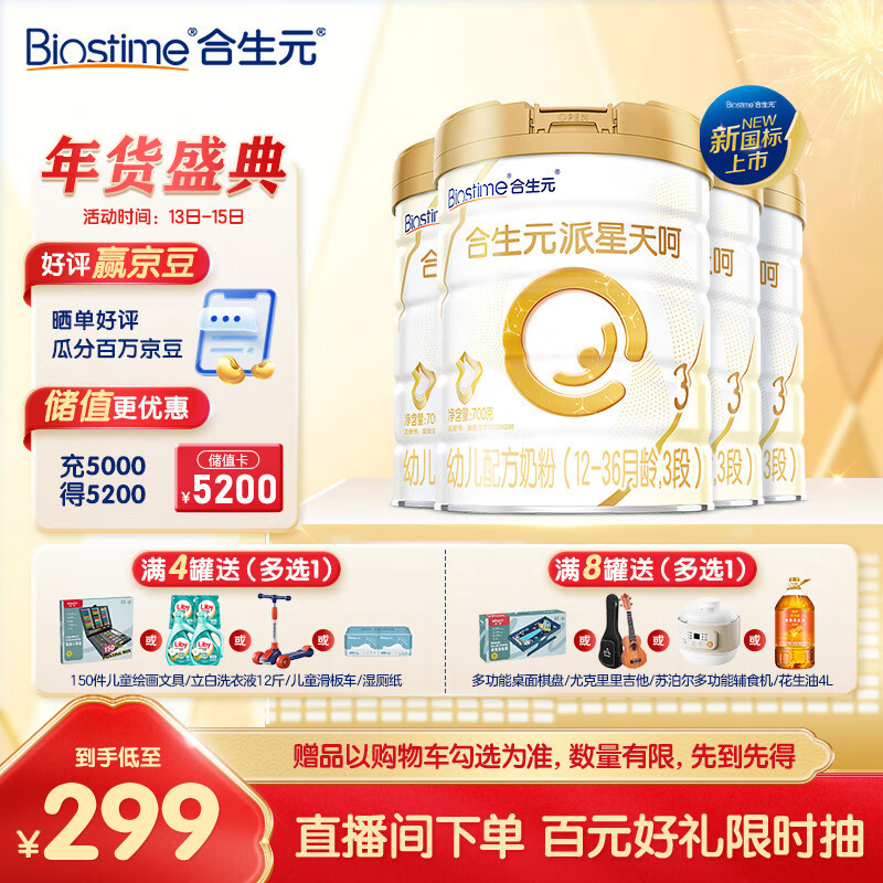 合生元(BIOSTIME)派星天呵幼儿配方奶粉 3段(12-36个月) 700克*4罐新国标乳铁蛋白价格:1328.00元!