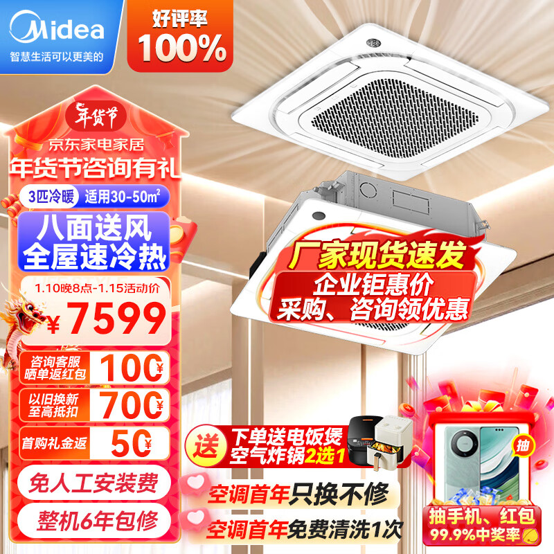 美的(Midea)中央空调 3匹天花机 嵌入式吸顶机商用空调 冷暖新能效220V RFD-72QW/DN8Y-D(D3)价格:7599.00元!