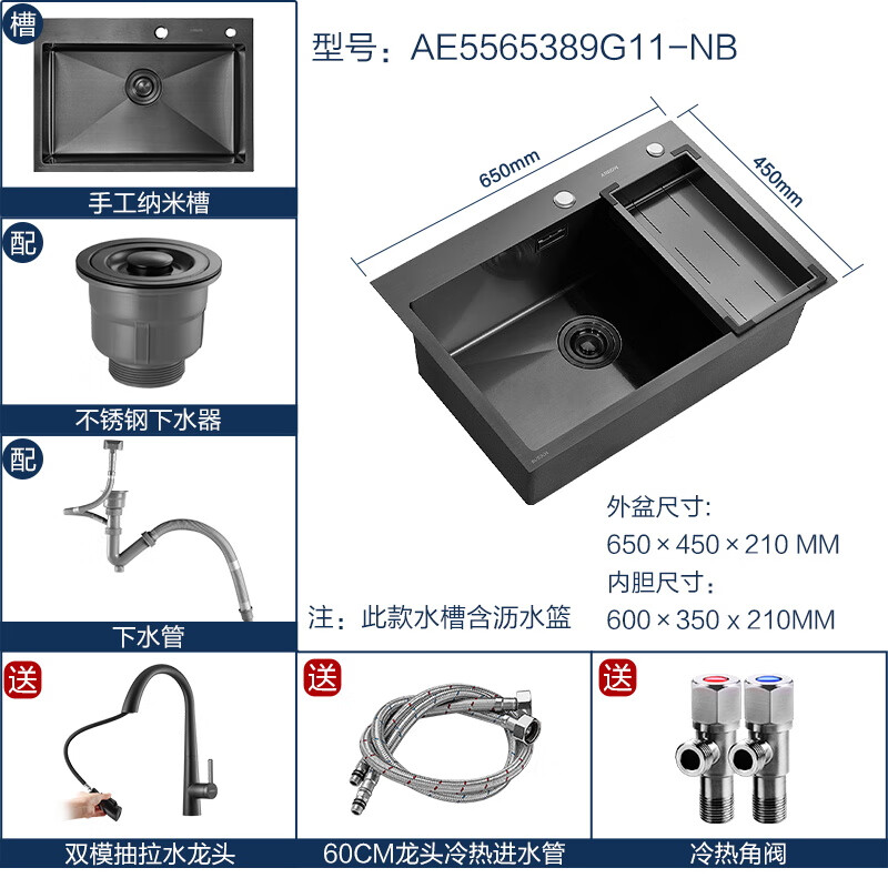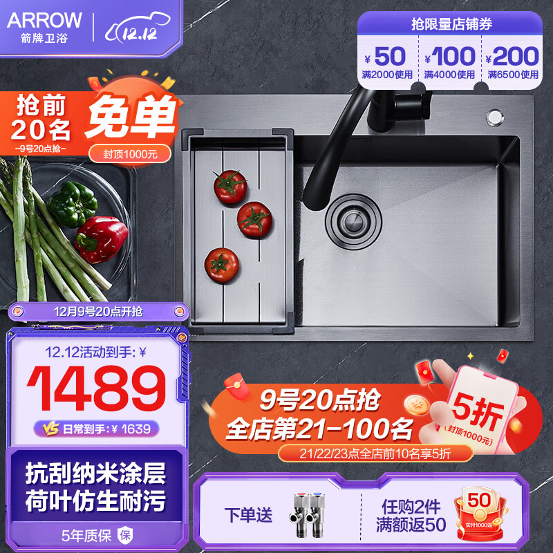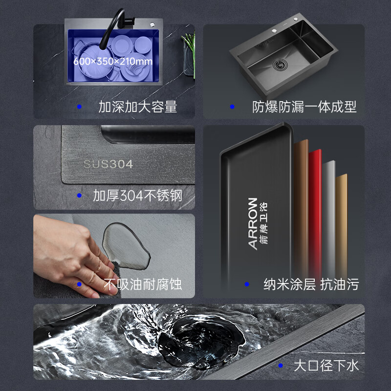箭牌(ARROW) 纳米手工单槽水槽304不锈钢加厚水槽洗菜盆洗碗盆台上台中台下 65*45黑纳米槽(含沥水篮+龙头)价格:1919.00元!