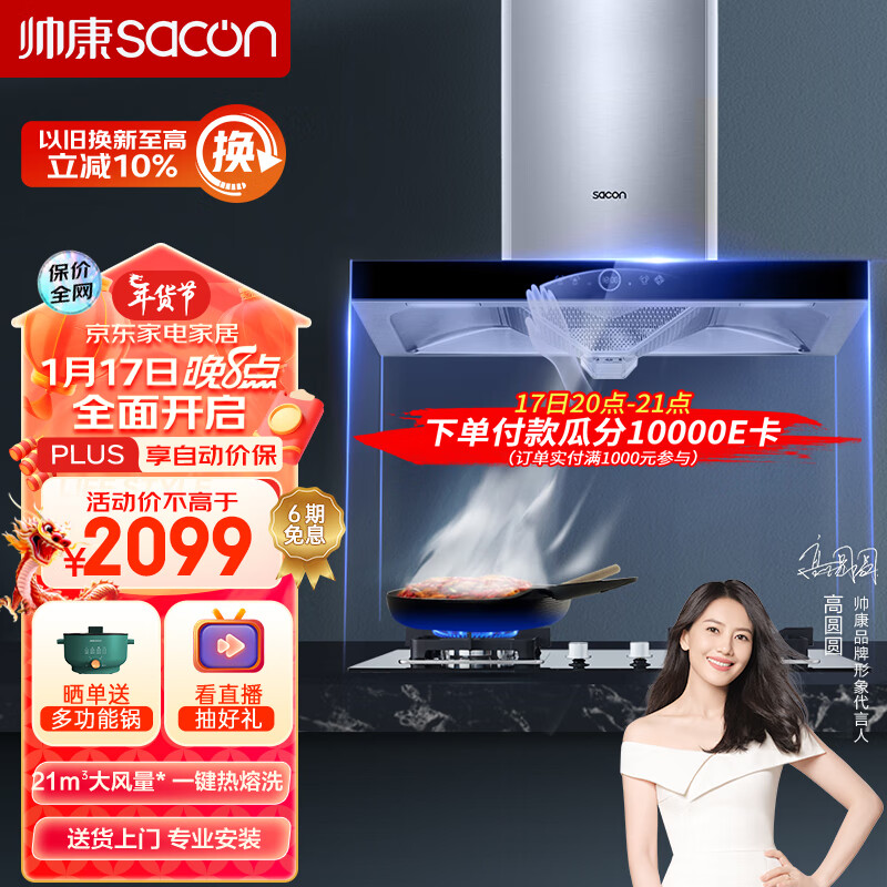 帅康(Sacon)抽油烟机烟灶套装家用21风量欧式抽油烟机燃气灶油烟机灶具套装挥手智控T8088+61B液化气价格:2099.00元!