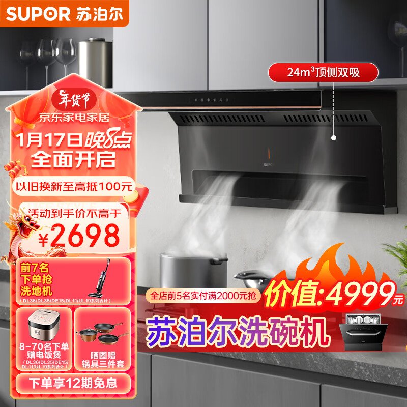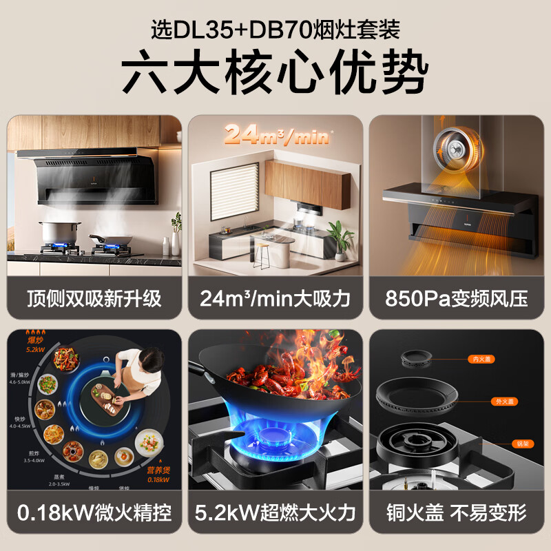 苏泊尔(SUPOR)抽油烟机 双腔拢烟顶侧双吸油烟机灶具套装 24立方大吸力变频烟灶 家用油烟机燃气灶 DL35+DB70天价格:2698.00元!