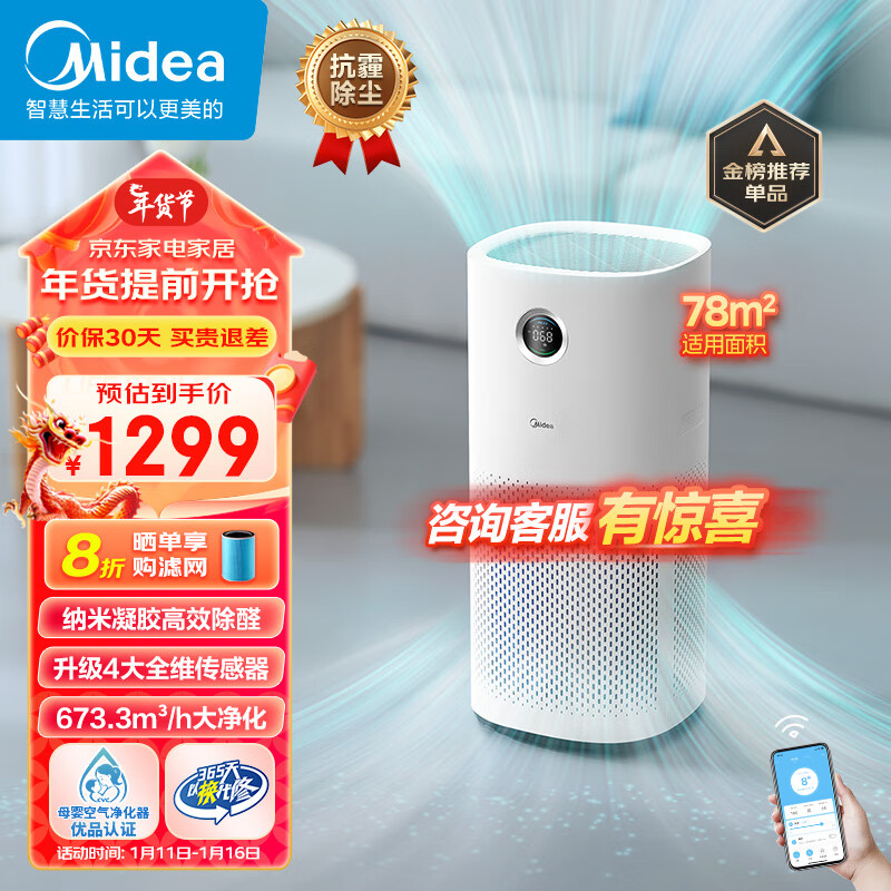 美的(Midea)【星澈空气护理机】空气净化器除甲醛空气净化器除烟味异味除菌六重净化家用新风机KJ600G-RX600价格:1699.00元!