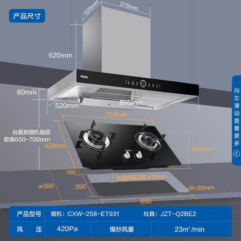 2、海尔的安装和售后100%值得信赖,顶吸的颜值很高,挥手开关也很灵敏,挥手即开,风量吸力大小ai智能感应不需要自己调解。燃气灶还没装,期待后续实际使用效果。安装的很快,师傅也很热情,干活麻利。