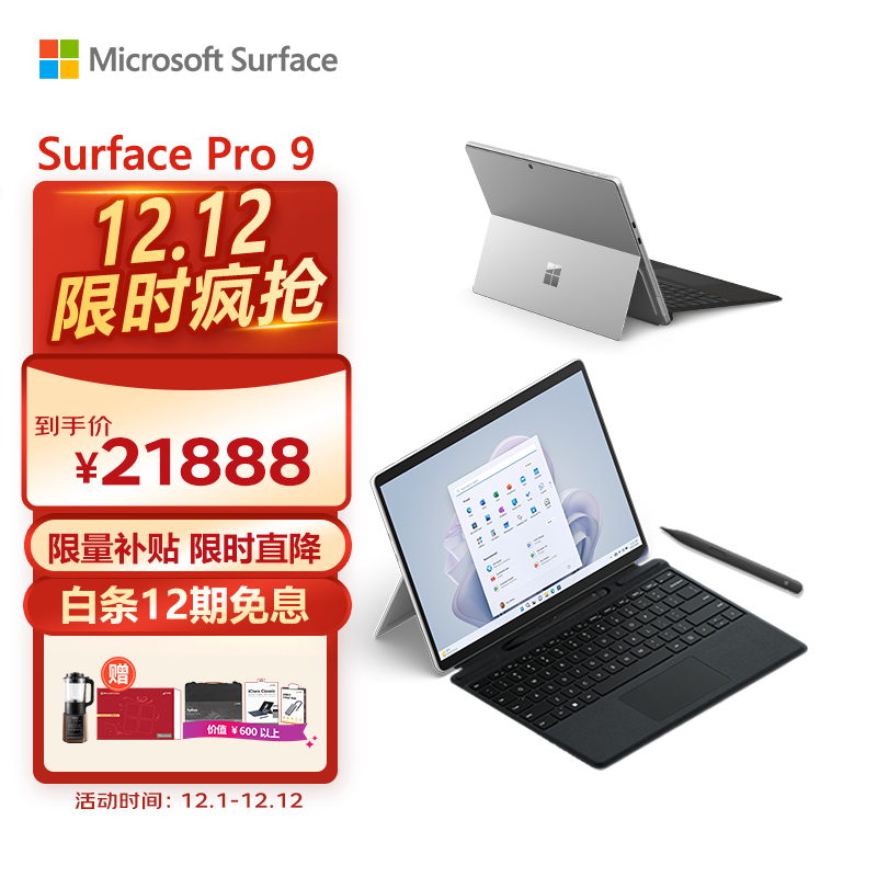 微软Surface Pro 9 亮铂金+典雅黑带触控笔键盘盖 i7 32G+1T 二合一游戏平板 13英寸120Hz触控屏 笔记本电脑价格:21888.00元!