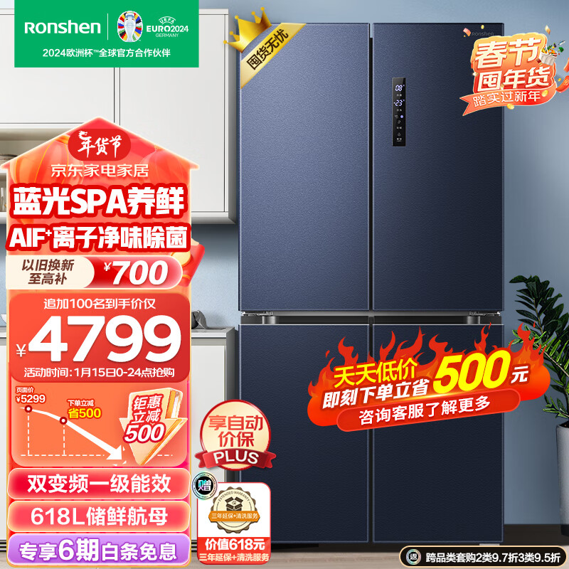 容声(Ronshen)蓝光养鲜618升变频一级能效冰箱十字对开门四开门风冷大容量BCD-618WD17FP净味干湿分储价格:5299.00元!