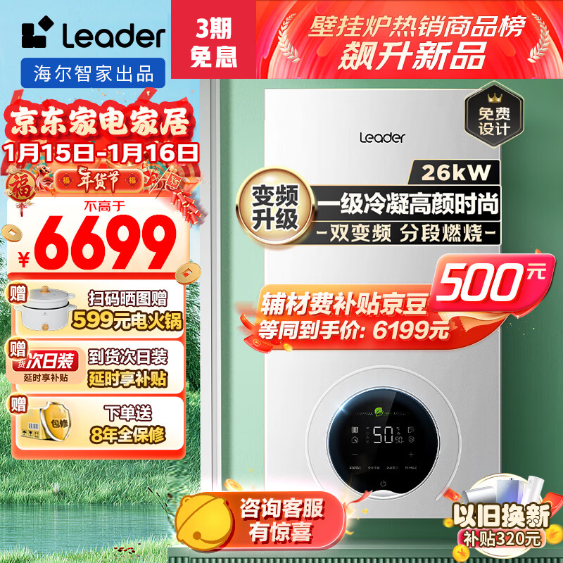 海尔(Haier)出品统帅变频一级能效冷凝壁挂炉天然气采暖炉热水器地暖生活水两用多点恒温LL1PBD26-LN1NMU1价格:6657.52元!