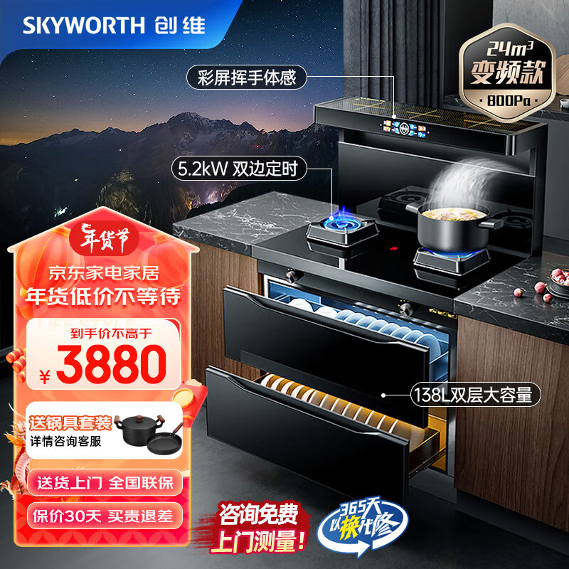 创维(Skyworth)集成灶一体灶 彩屏智能变频大吸力 家用环保灶定时燃气灶 AI语音声控 烟灶消套装J001B天然气价格:3880.00元!