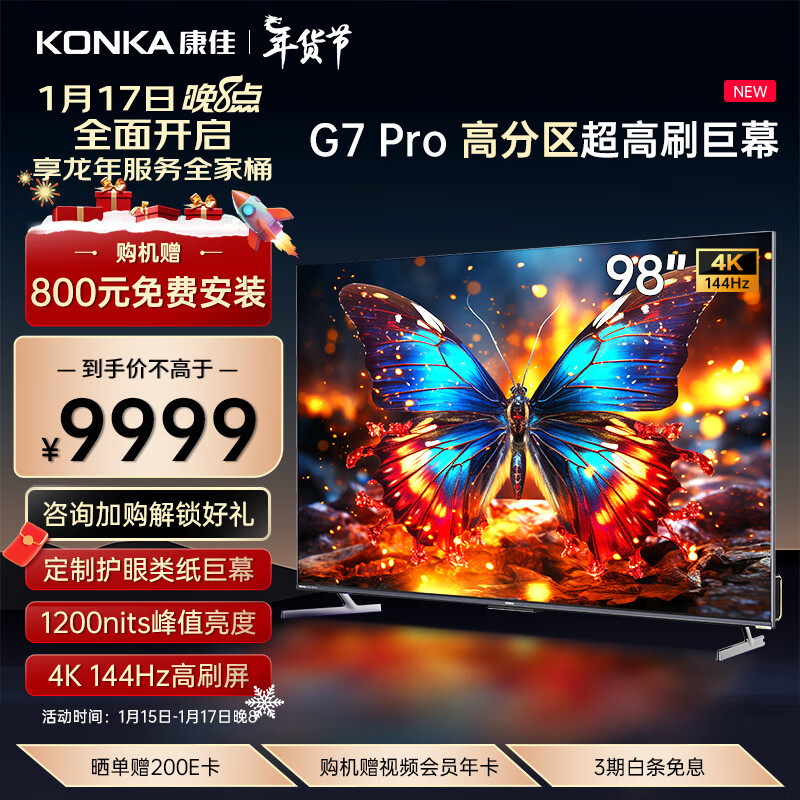 康佳电视 98G7 PRO 98英寸 百级分区144Hz游戏电视 4+64GB 4K超清巨幕智能液晶平板电视机100 以旧换新价格:9999.00元!