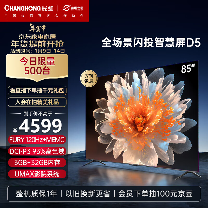 长虹电视85D5 85英寸4K超清120Hz高刷 3+32GB 93%P3高色域 杜比音画 智能平板液晶LED电视机 以旧换新价格:4599.00元!