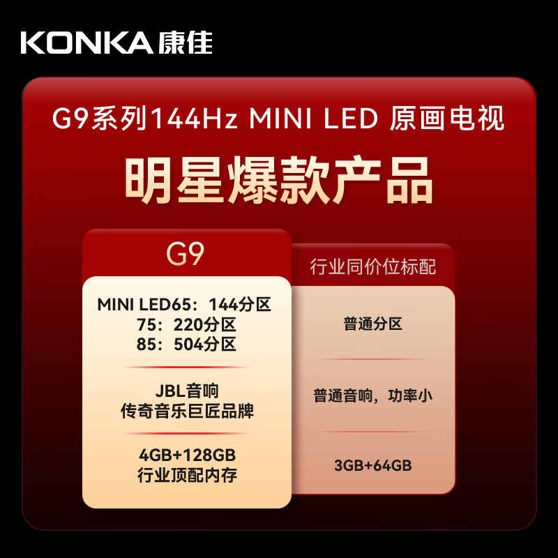 康佳电视 85G9 85英寸 Mini LED 144Hz 1200nits 4+128G 4K超清屏智能液晶平板游戏电视机以旧换新价格:7999.00元!