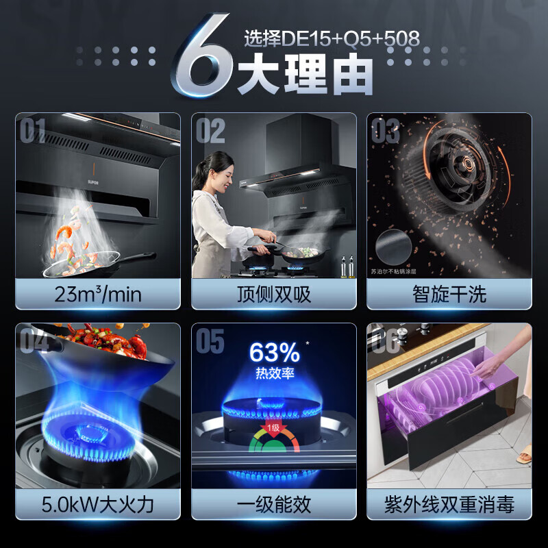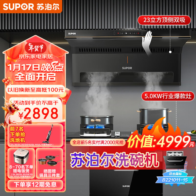 苏泊尔(SUPOR) 烟灶消顶侧双吸7字型大吸力 23立方免拆洗油烟机燃气灶消毒柜多件套 DE15+Q5天然气+508价格:2998.00元!