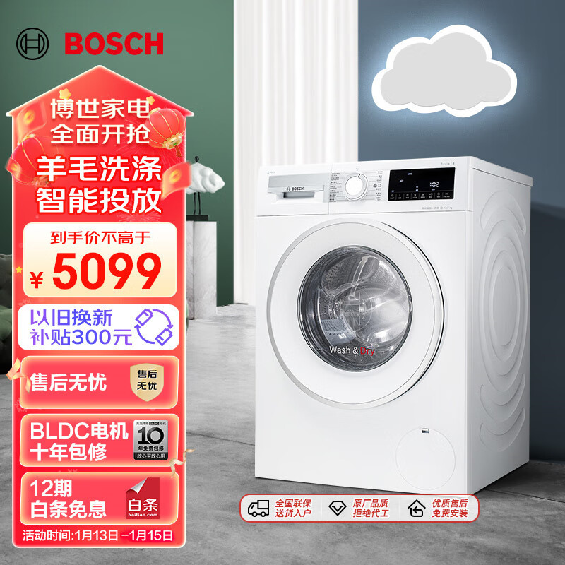 博世(BOSCH)【云朵白】10公斤全自动家用滚筒洗衣机洗烘一体机 i-Dos系统 绿标羊毛护理 XQG100-WNE152A0AW价格:5099.00元!
