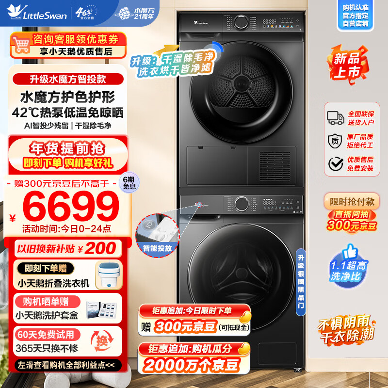 小天鹅(LittleSwan)水魔方洗烘套装 10KG滚筒洗衣机全自动+热泵烘干机 智能投放 干湿除毛 TG100V618PLUS+617价格:6999.00元!
