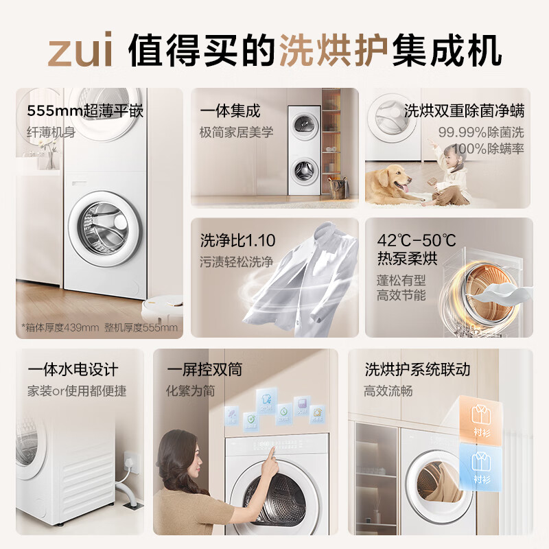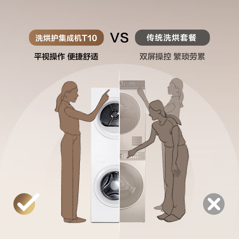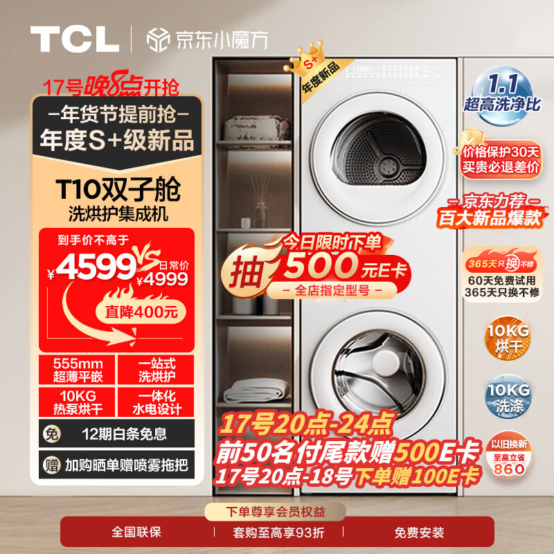TCL GH200T10-W 双子舱洗烘护集成机一体式洗烘套装 超薄全嵌 10KG全自动滚筒洗衣机+10KG热泵烘干机价格:4598.00元!