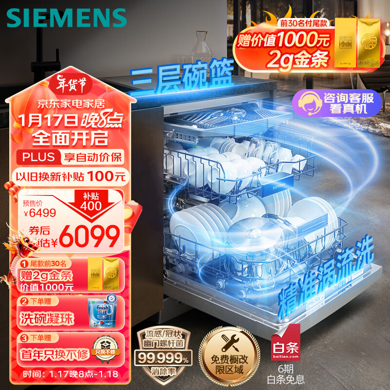 西门子16套大容量除菌消毒 独嵌两用全能舱洗碗机嵌入式 精准涡流洗 智能抽湿烘干 96h存储 SJ23HI88MC价格:6499.00元!