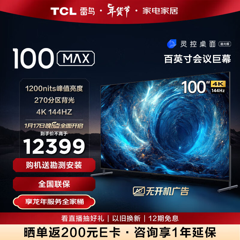 TCL雷鸟 100MAX 100英寸巨幕 电视机 144Hz 4+128G 270分区 WiFi6 游戏智能液晶会议平板100S545C Max价格:12399.00元!