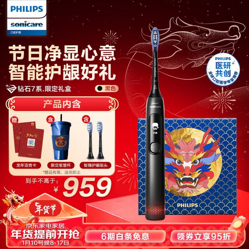 飞利浦(PHILIPS)电动牙刷成人情侣款 新年礼物 送女友/男友5种模式 2支护龈刷头钻石7系极夜黑 新年龙年限定礼盒价格:1009.00元!