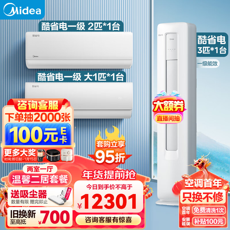 美的(Midea)新一级能效 酷省电 温馨两居套餐(大1匹一级能效+2匹一级能效+3匹一级能效)价格:12947.00元!
