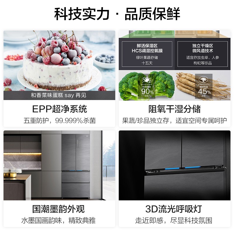1、体验了一段时间,这台冰箱全空间保鲜技术很不错,温度控制的精准,法式冰箱的下方的两个储存空间很大,方便存放大件的冷冻品,并且表面没有结霜的情况出现,EPP的冷冻,冷藏双除菌效果可以,并没有串味,湿仓存储水果保鲜效果很好,上方的大抽屉也可以一定程度上起到保湿作用,APP的软件功能可以提示食物的储存时间,对需要生活比较细心记录人群比较友好,冰箱噪音很小,“零嵌入式"的格局节省了贴个空间,下部前出散热设计对后续节能有了很好的控制!