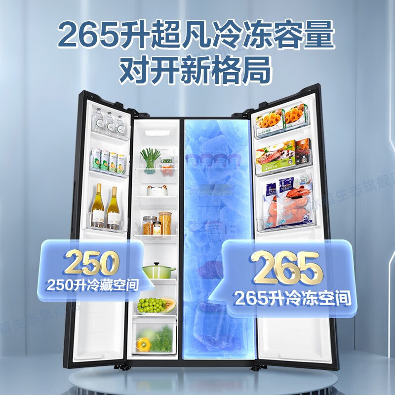 3、外形外观:外观很时尚,蓝色很特别制冷效果:制冷效果很满意容量大小:十字开门467L大容量,可以满足一家人的食物需求