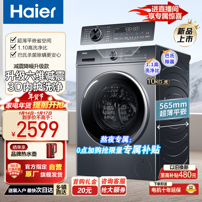 海尔(Haier)小恒星全自动滚筒洗衣机10公斤 智能投放 超薄平嵌 六维减震 变频洗脱一体洗衣机BD1216 以旧换新价格:2599.00元!