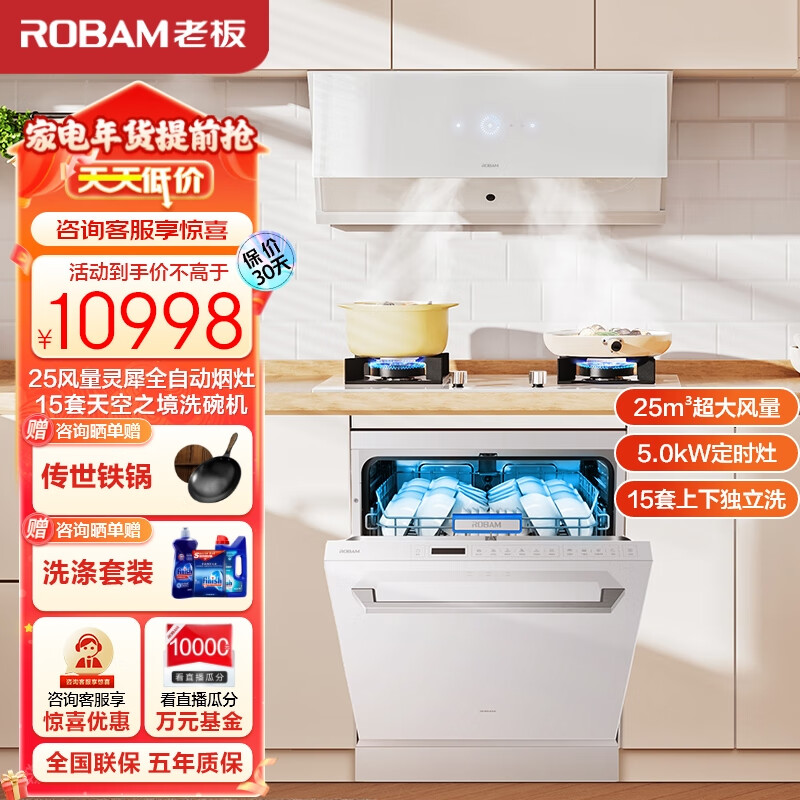 老板(Robam)灵犀全自动侧吸25风量变频烟灶搭配15套独嵌两用洗碗机白色烟灶洗三件套29X8S+37B8XW+F80D价格:10998.00元!