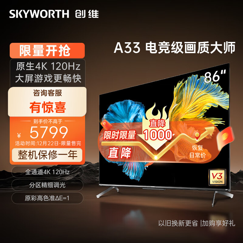创维电视86A33 86英寸全通道4K 120Hz高刷3+64G护眼声控屏游戏平板电视机价格:5799.00元!