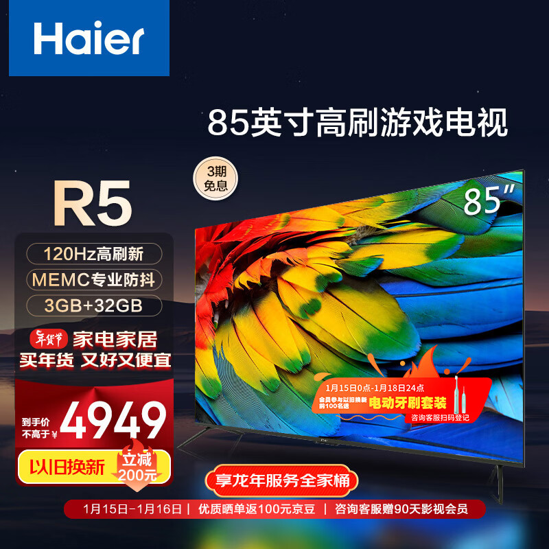 海尔(Haier)85R5 85英寸广色域巨幕影院电视120Hz高刷4K超高清声控智慧屏液晶教育电视机3GB+32GB价格:4949.00元!