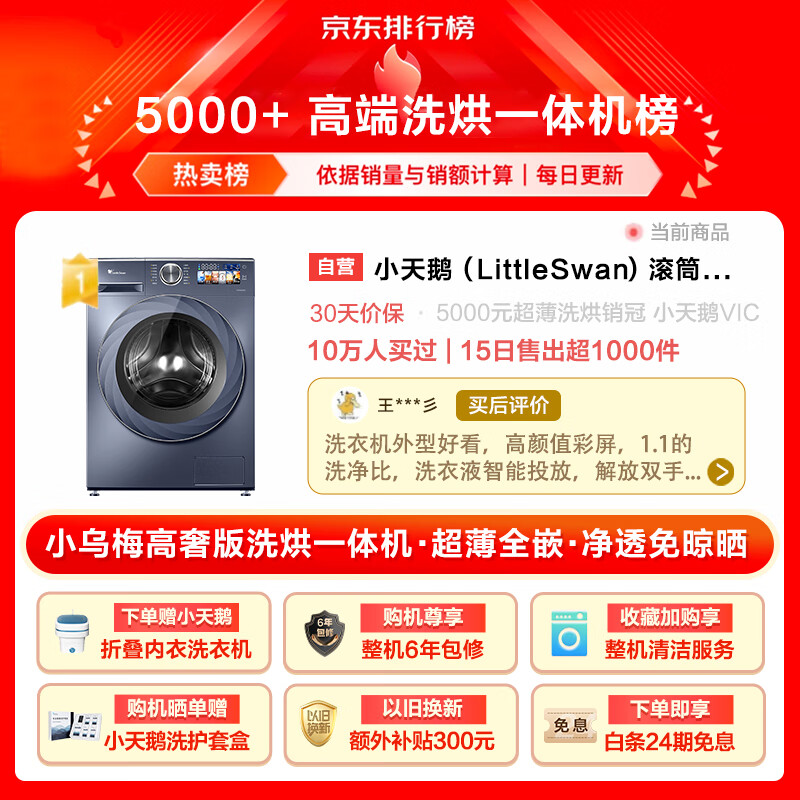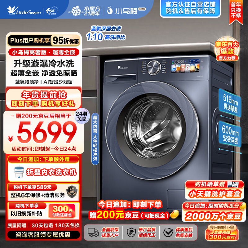 小天鹅(LittleSwan)滚筒洗衣机全自动 超薄全嵌【小乌梅高奢版TD100VIC】洗烘一体机 516mm机身 蓝氧特渍净 10公斤价格:5899.00元!