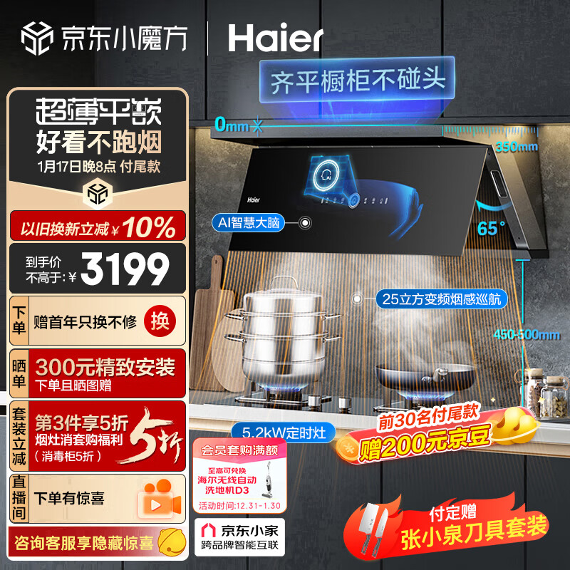 海尔(Haier)抽油烟机 超薄近吸烟灶套装 25m3/min变频有效风顶侧双吸外观 家用吸油烟机燃气灶具C21U1+Q2BE7天价格:3399.00元!