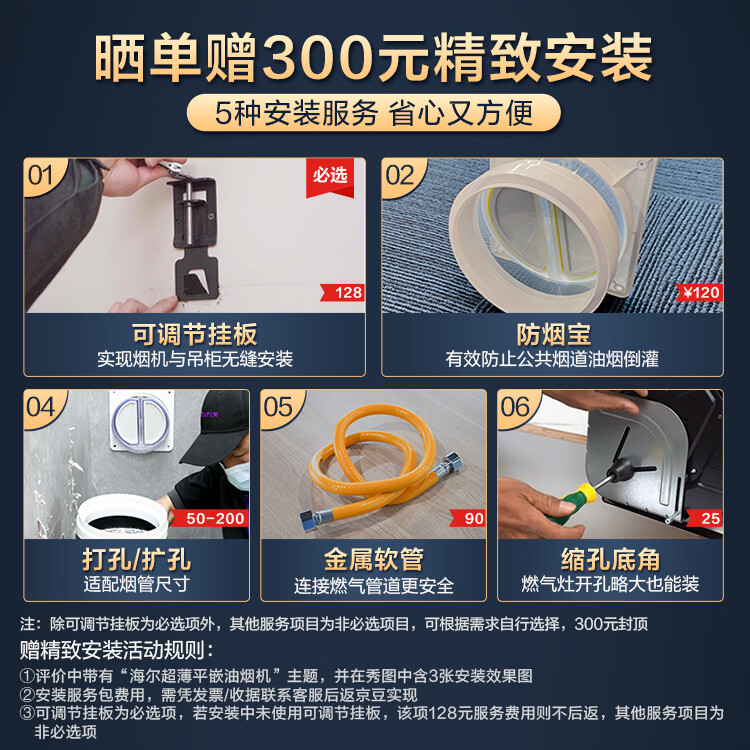 4、海尔超薄平嵌油烟机,选择的精致安装,安装师傅非常热心,主动沟通解决问题,安装手法细致。我购买的烟机灶具套装,非常好用,海尔品牌,值得信赖!