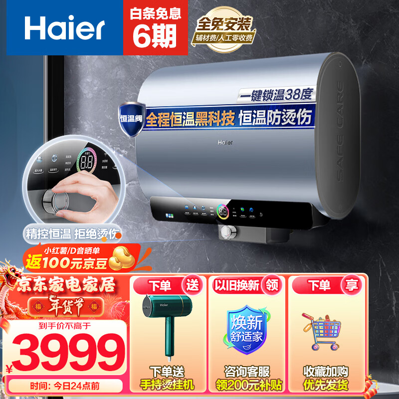 海尔(Haier)60升家用全隐藏式安装电热水器3000W速热 新一级能效 全管路恒温 镁棒免更换 EC6003-WARM7U1价格:4399.00元!