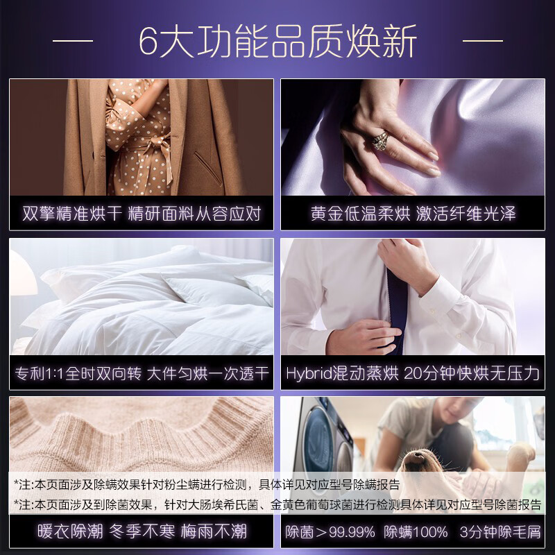 5、用了近两个星期来评价的。首先,滚筒洗衣机的静音效果蛮好,快洗都挺干净的,且只需要15分钟,智能的这块不错,容量大;其次,烘干机强大,洗衣的香味能保留,细小的毛毛能全部吸到专门的地方,黑衣服的上面都没有毛,对于养宠物的家庭非常合适。非常推荐!