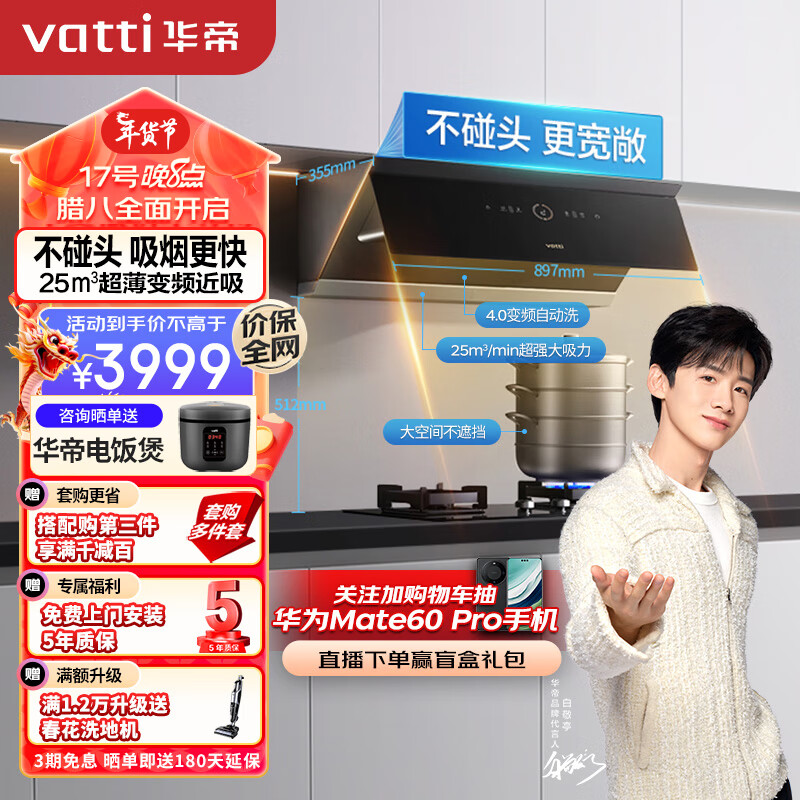 华帝(VATTI)抽油烟机家用变频大吸力烟机燃气灶烟灶套装25风量自动清洗侧吸油烟机灶具套装i111A2液化气价格:3998.00元!