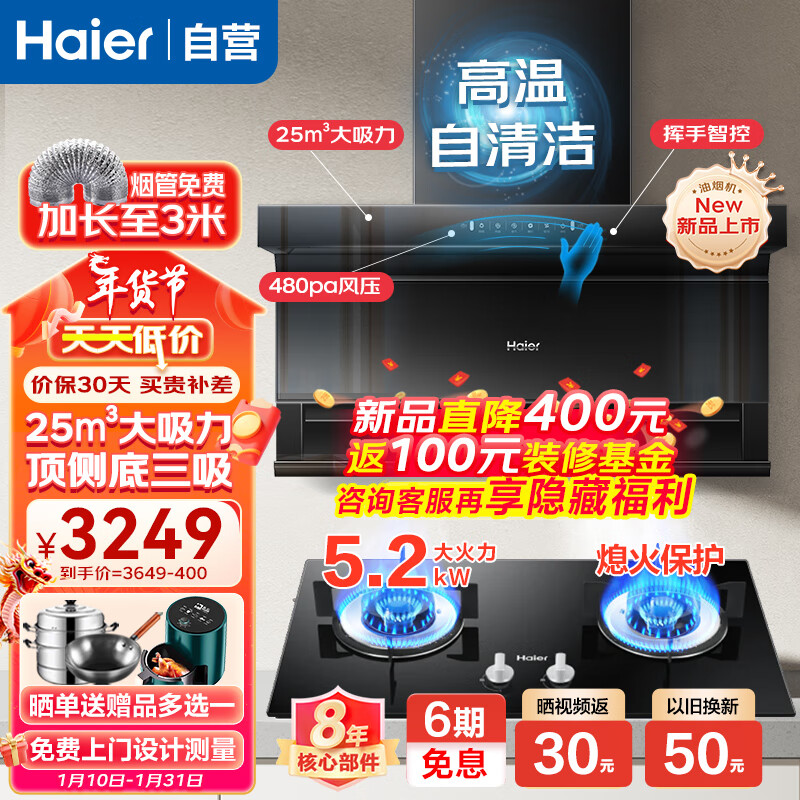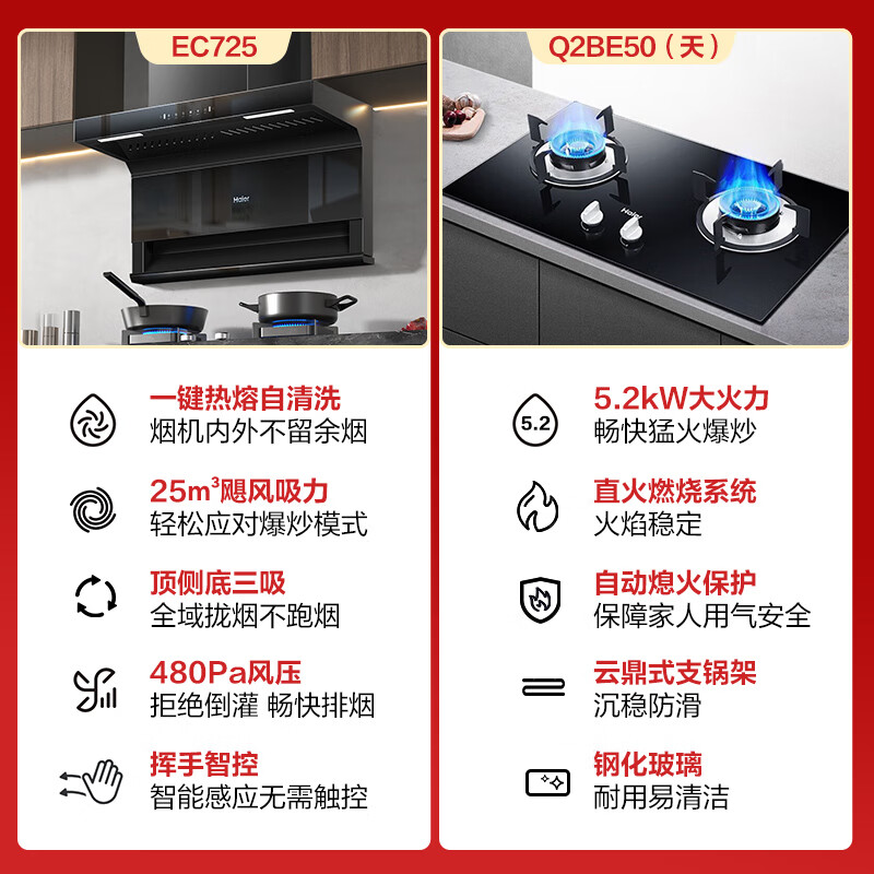 海尔(Haier)油烟机燃气灶套装 7字型顶侧双吸 挥手智控 25m3大吸力自清洁抽油烟机725+5.2KW大火力然气灶BE50价格:3349.00元!