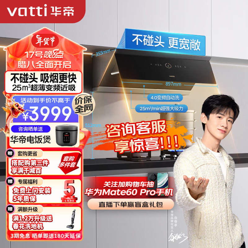 华帝(VATTI)抽油烟机家用超薄侧吸变频大吸力顶侧双吸烟机燃气灶具烟灶套装25风量自动清洗i111A2天然气价格:3998.00元!