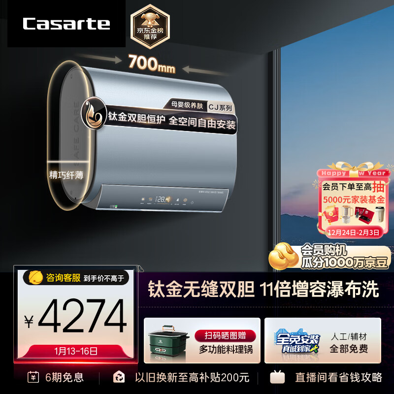 卡萨帝(Casarte)60升储水式电热水器家用超薄钛金无缝双胆扁桶型短款双驱速热一级能效CEC6005-CJ5U1【以旧换新】价格:4499.00元!