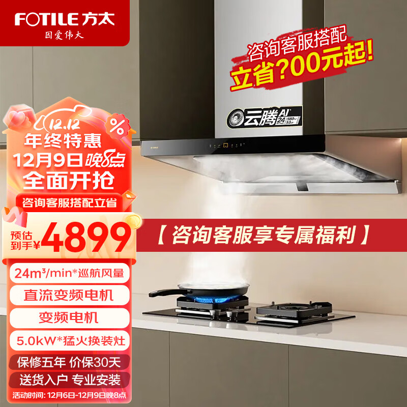方太(FOTILE)油烟机灶具套装直流变频电机24立方巡航风量5.0猛火套餐智能巡航增压EMQ5T+TH29B(天然气)价格:4899.00元!