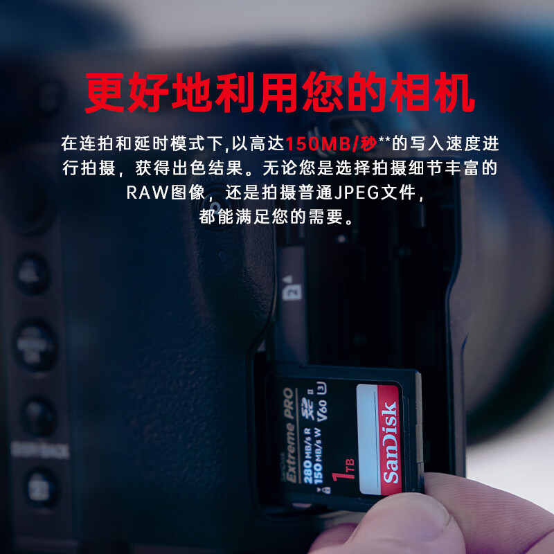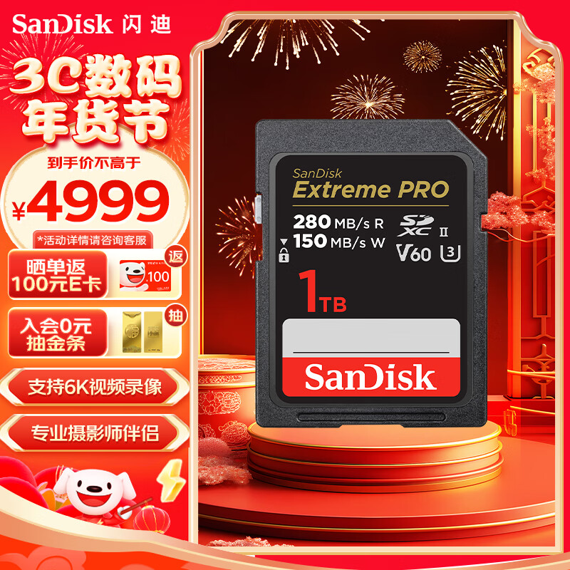 闪迪(SanDisk)1TB SD存储卡U3 C10 6K数码相机内存卡读速280MB/s 写速150MB/s 支持V60高清视频 畅快连拍价格:4999.00元!