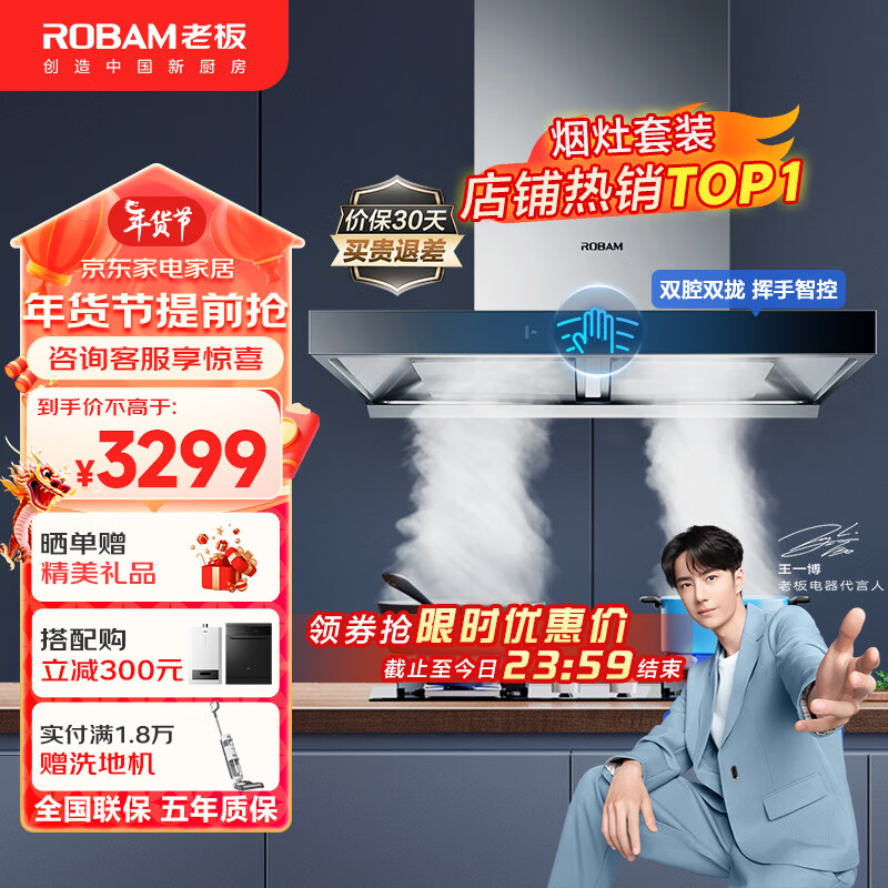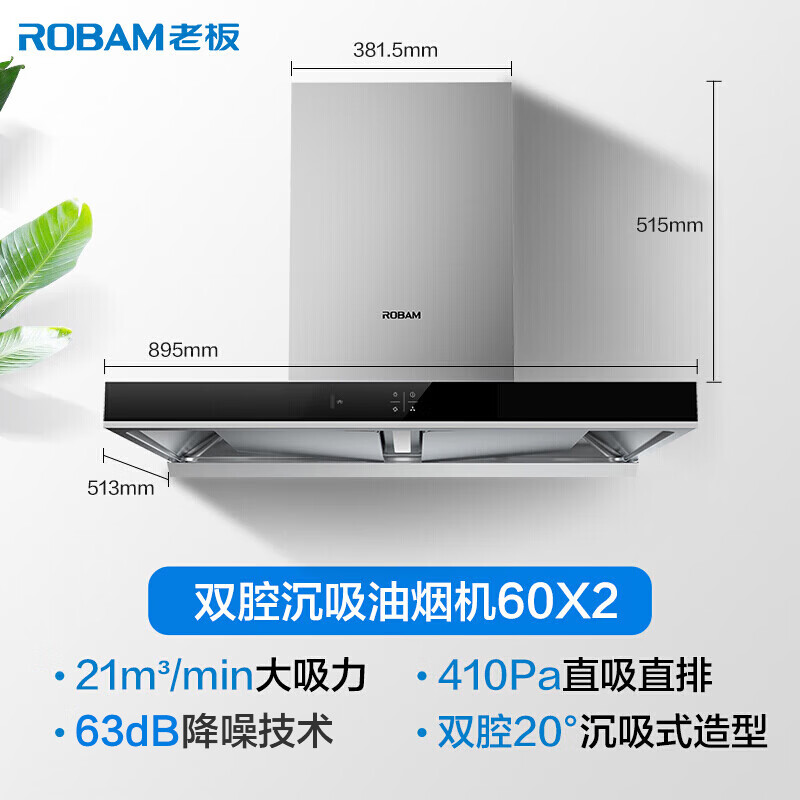 老板(Robam)抽油烟机 欧式顶吸式21立方大吸力双腔家用吸油烟机挥手智控家用燃气灶 烟机灶具60X2套装 (灶具天然气)价格:3599.00元!