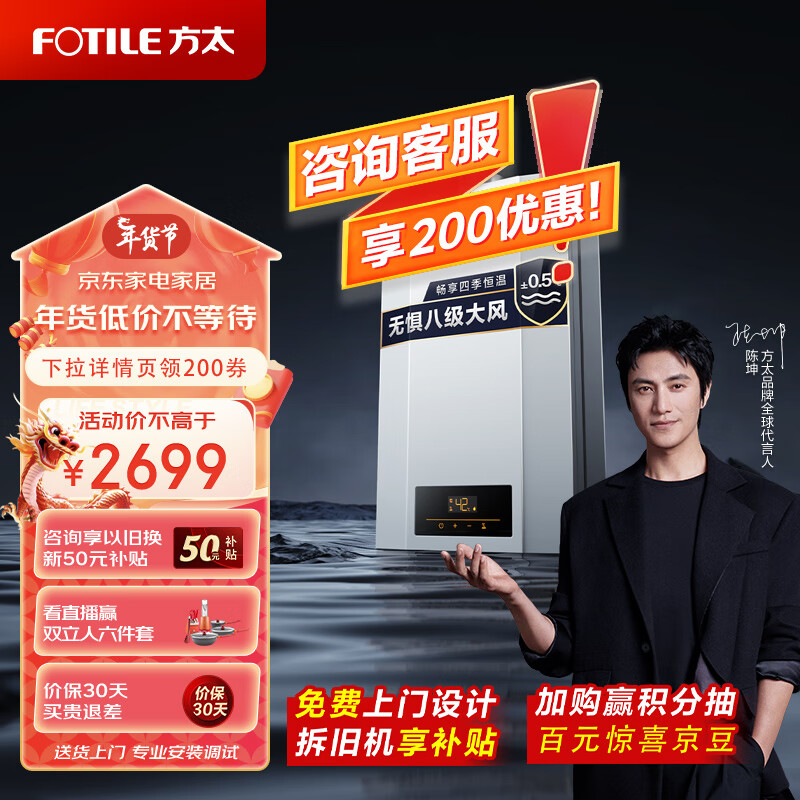 方太天然气16升燃气热水器 家用强排式 智能恒温变频 高层抗风低水压启动 多点用水不干扰JSQ30-P16D1价格:2699.00元!