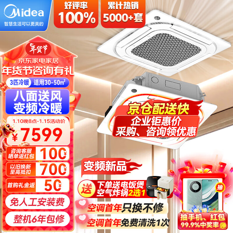 美的(Midea)中央空调3匹天花机 吸顶空调吊顶空调一拖一 变频冷暖新能效 220V RFD-72QW/BDN8Y-D(B3)京仓派送价格:7599.00元!