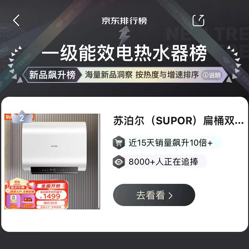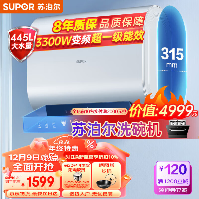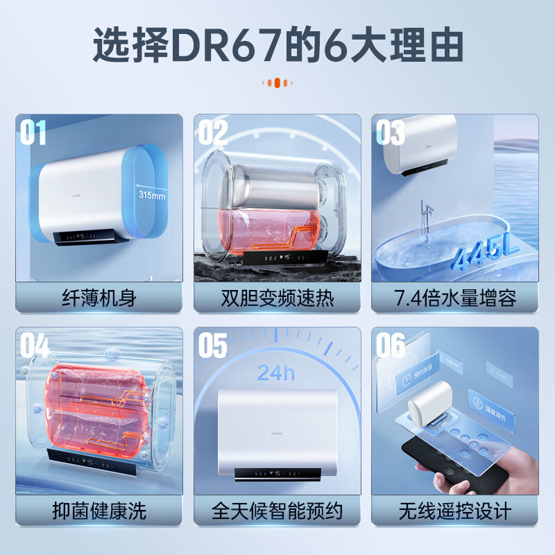 苏泊尔(SUPOR)扁桶双胆60L家用电热水器储水式 超薄机身3300w变频速热 一级能效节能省空间 E60-DR67价格:1699.00元!