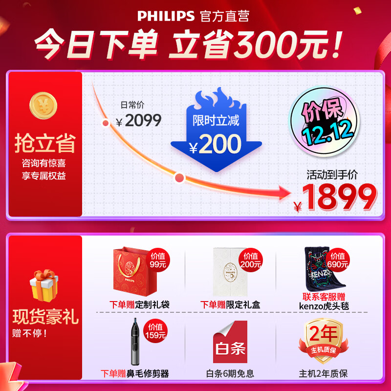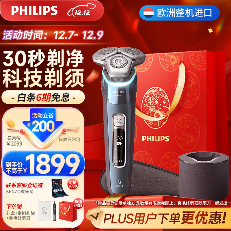 飞利浦(PHILIPS)男士电动剃须刀蜂巢9系Pro SkinIQ智能光感刮胡刀原装进口【礼物送男友送爸爸】S9982/50价格:1999.00元!