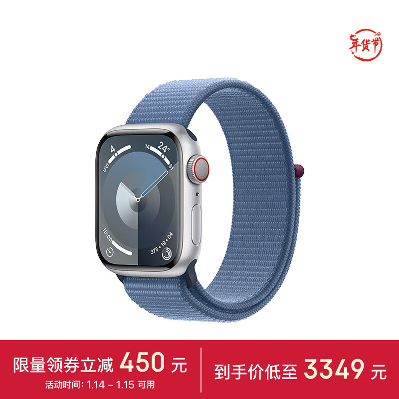 Apple/苹果 Watch Series 9 智能手表GPS+蜂窝款41毫米银色铝金属表壳凛蓝色回环式运动表带电话手表S9 MRJN3CH/A价格:3799.00元!