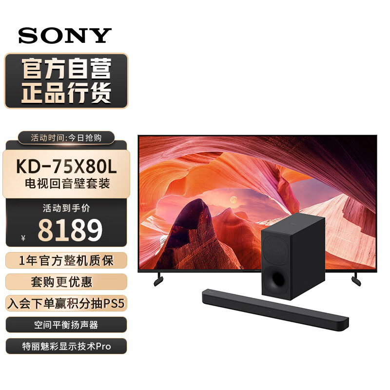 索尼(SONY)KD-75X80L+HT-S400 影音娱乐套装 杜比音效 智能环绕 大功率无线低音炮 家庭影院 回音壁价格:8189.00元!