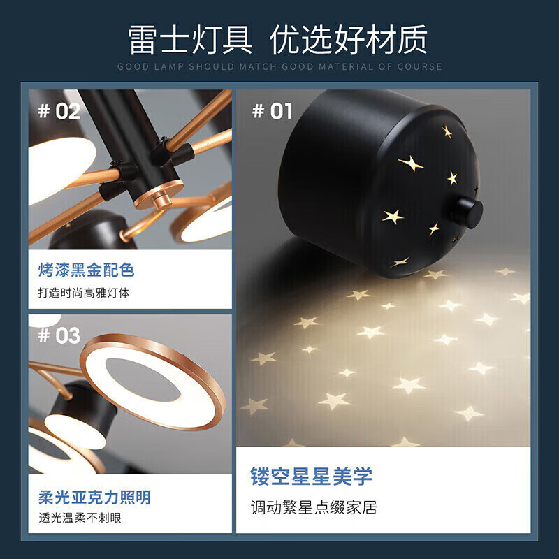 4、这款客厅灯非常漂亮,满天都是小星星,很温馨哦,也很节能。雷士照明质量很好,京东送货非常快,关键时候也特别好。